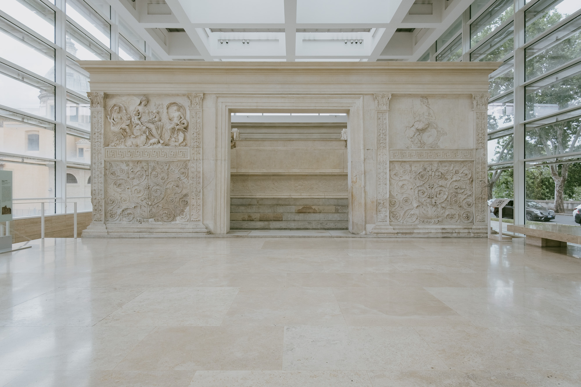 L’Ara Pacis è situata nel centro di Roma, all’interno di un moderno museo progettato da Richard Meier, che la ospita in un ambiente luminoso e aperto. Il monumento è adornato da rilievi e decorazioni che illustrano scene di divinità romane, personaggi storici e rappresentazioni delle virtù civiche. I dettagli scolpiti raccontano storie di sacrificio, prosperità e la venerazione degli dei, riflettendo le ideologie politiche e culturali dell’epoca.